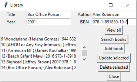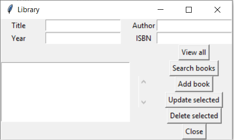 Library is a app where user can add books, view the saved books, search for the book exists in the database, delete any entry of the book, they can also add books and update the book list. There are four fields to fill for adding books or update. This app is build with python using Tkinter. there are two script one is for fontend and another is backend. In frontend I use Tkinter to design the app and connect with the database and listener for the commands. And backend script I use sqlite3 that comes autometically with the python I just import it no need to install it.