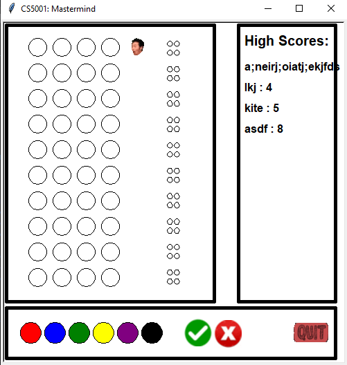You can make a guess by clicking the marbles at the bottom of the screen, filling the guess in at that interval. Clicking the X button will clear it, while the checkmark submits that guess to be evaluated. A red mark in the evaluation indicates that there is a correct color in the guess, while a black mark indicates that the correct color is in the correct position. The game ends and records your # of guesses when you guess the code correctly.