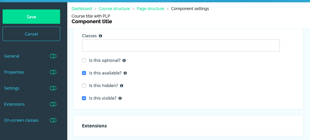 - Open course B and add a text component and edit the text component clicking save, notice no extensions are show (which is correct)