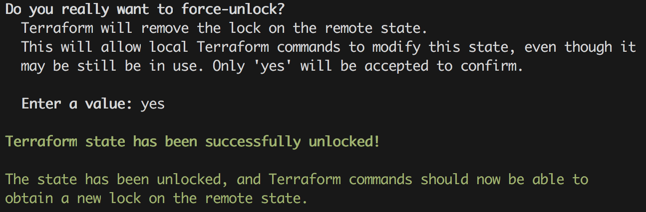 Useful for cases where the tf states are stored remotely (ie. in an S3 bucket) with DynamoDB locking. If something happens (eg. credentials expire, terraform crashes), it would be useful to have a way to remove the lock that was acquired. Currently, this can only be done manually, by going to DynamoDB and removing the entry (the lock). However, terraform has a command to remove it.