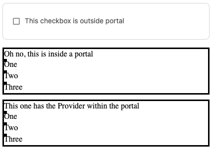 Components should look and feel the same whether they were rendered using ReactDOM.render or ReactDOM.createPortal