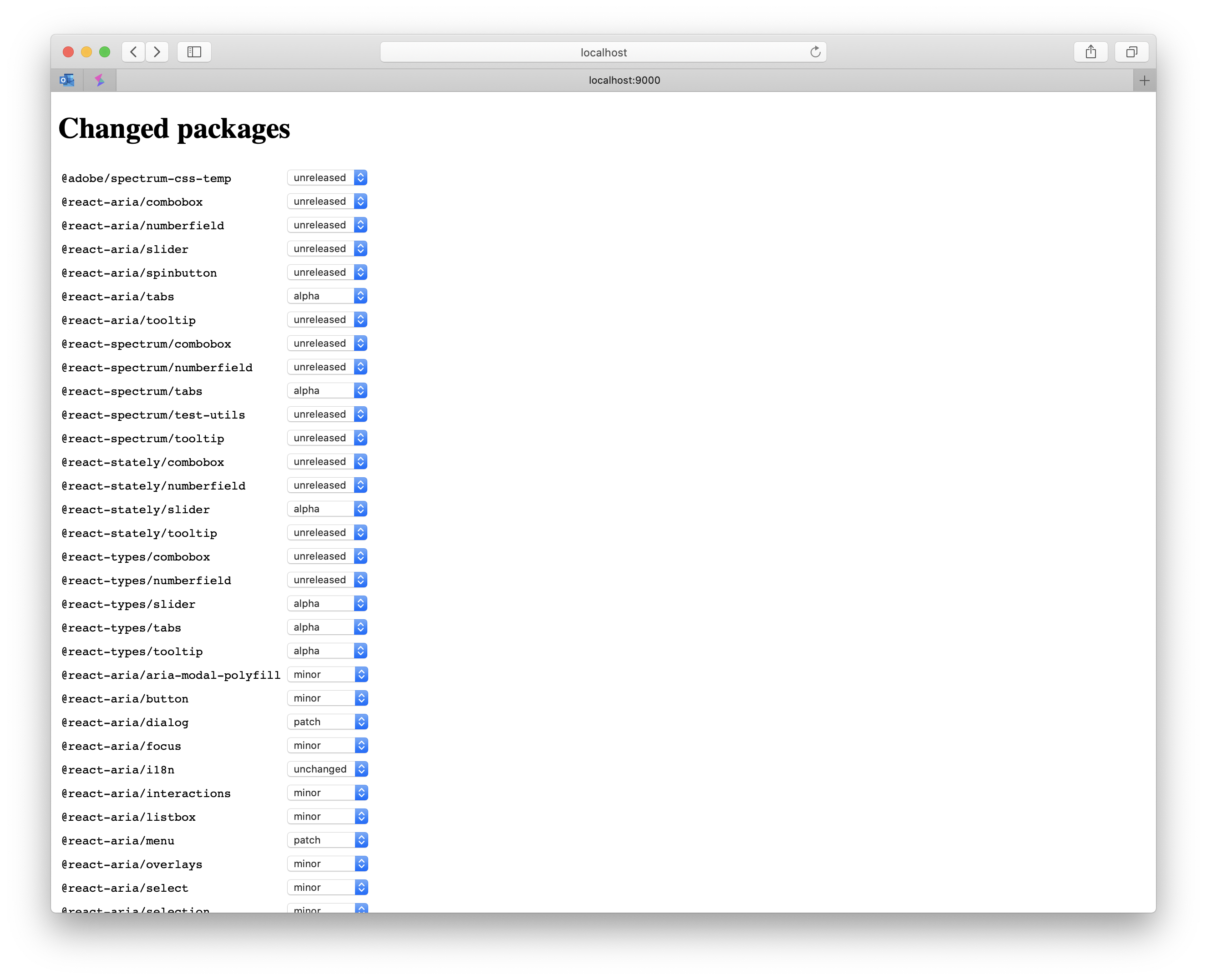 This updates the script to bump versions of packages to have a UI for selecting how to bump the version for each package (e.g. alpha, patch, minor, major, etc.). It starts a simple web server and triggers your browser to open to a page listing all of the changed packages.