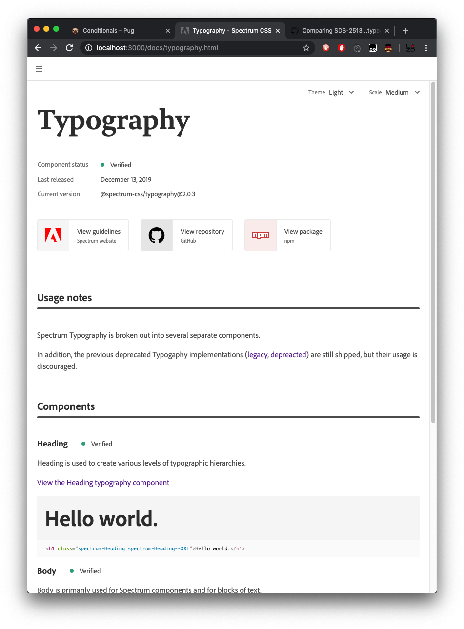 * docs: swap out the Typekit Ids * docs: typography metadata fixes and deprecation bits (#523) * docs: support hiding examples, disabling fastLoad * docs: support changing Variants heading, enable Spectrum cards * docs: Typography landing page * docs: hide old Typography (but link to it from the main page) * docs: remove Tool from menu, fix ButtonGroup Spectrum link * docs: add link to Tool in ActionButton description Co-authored-by: Larry Davis <lazdnet@gmail.com>