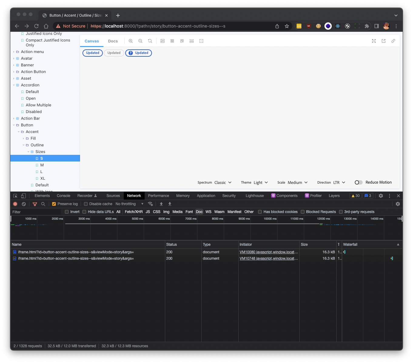 - I made some changes to see how quickly storybook updated. It updated very quickly, but I noticed that it updated twice (about 8s apart):