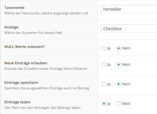 Der Punkt Einträge laden muss auf JA stehen, damit sich der Wert beim Speichern eures Produkts die Werte aus der gesetzten Taxonomie automatisch zieht.