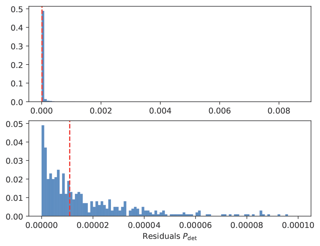 Seconly, I compare the perfomance of the P(m1,m2,z) interpolator of detectability against 1000 bruce force SNR computations from lal. Altough occasional mismathces of 3% are found, the median residuals are as small as ~1e-5. This plot can be generated with:
