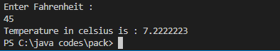 System.out.printf("The celcius of "+a+" degree fahrenheit is : "+(a-32)/1.8);