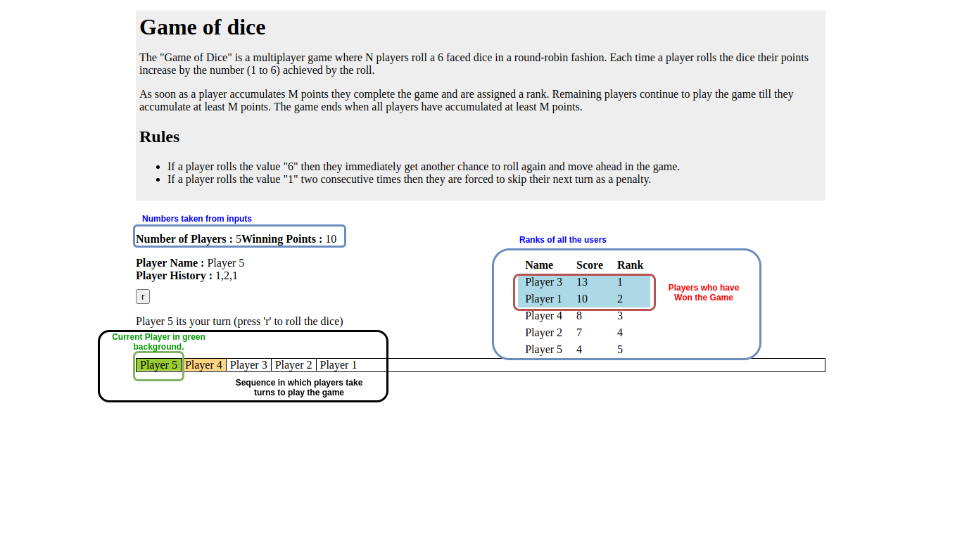 Step 2 : Press r to roll the dice for player N. Sections of the game have been elaborated in the screenshot.