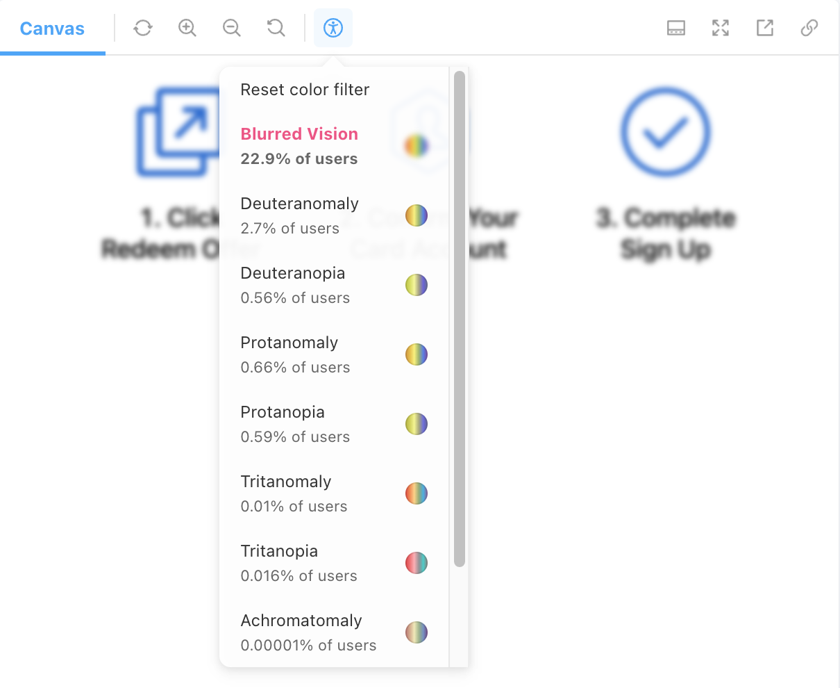 Color blindness emulator - A11y provides a color blindness emulator for visual testing.