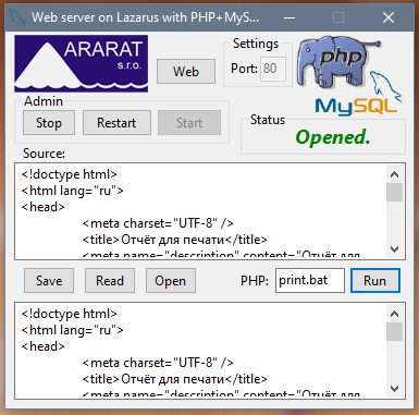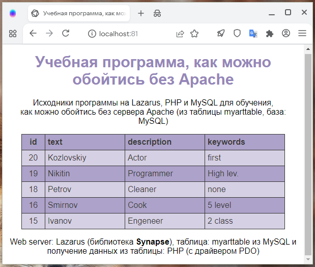Исходники показывают, как можно обойтись без сервера Apache. Для работы программы необходимо выполнить скрипт test.sql из каталога с исходниками и отредактировать путь к PHP в файле print.bat - при необходимости. Результат работы веб-сервера с подключением к MySQL из PHP (драйвер PDO) демонстрируется в браузере, далее.