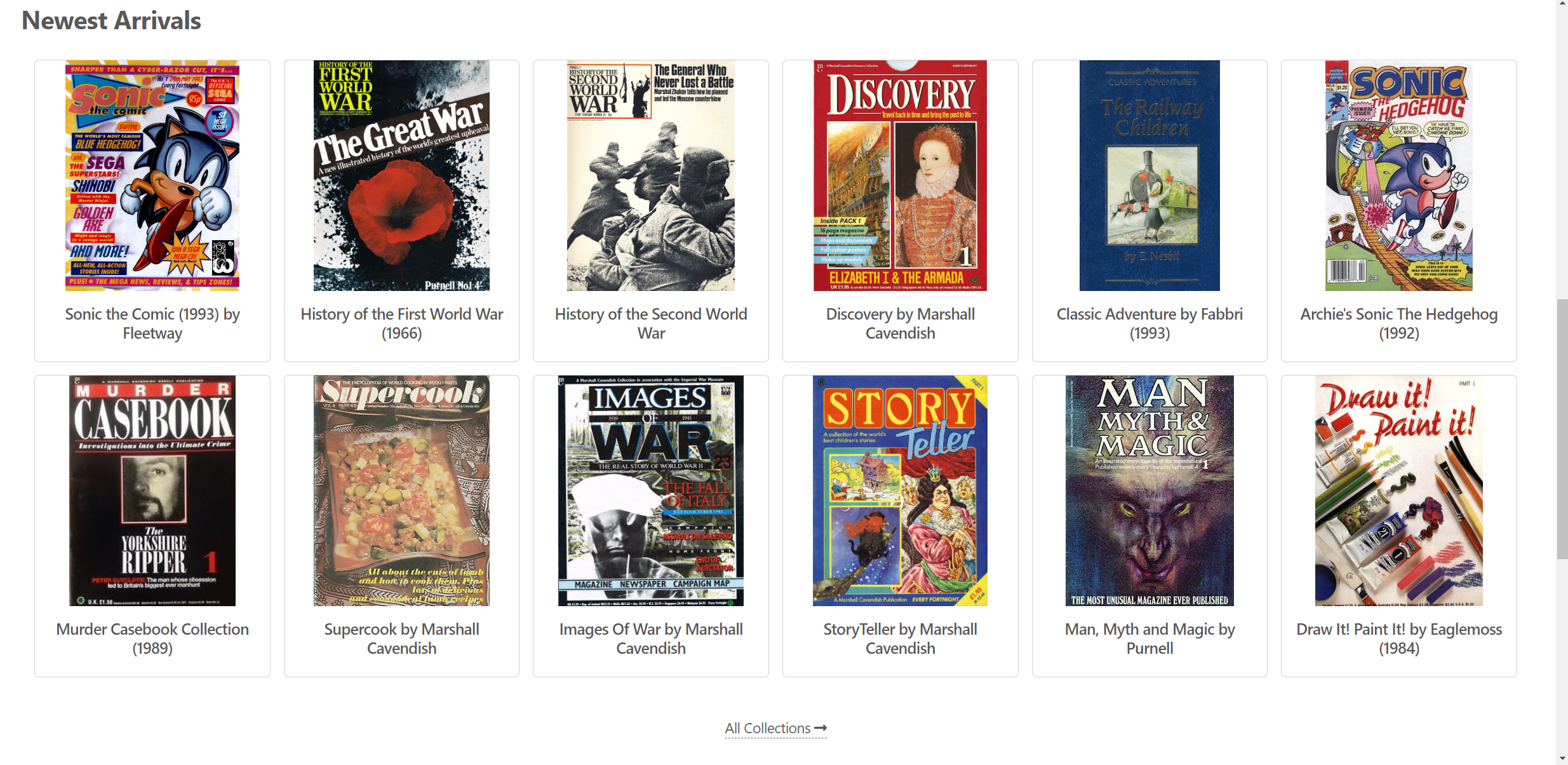 The final image shows a number of images on Bootstrap cards that allow the rows to be adjusted depending on the screen size. They are also links that will take you to the collections page.