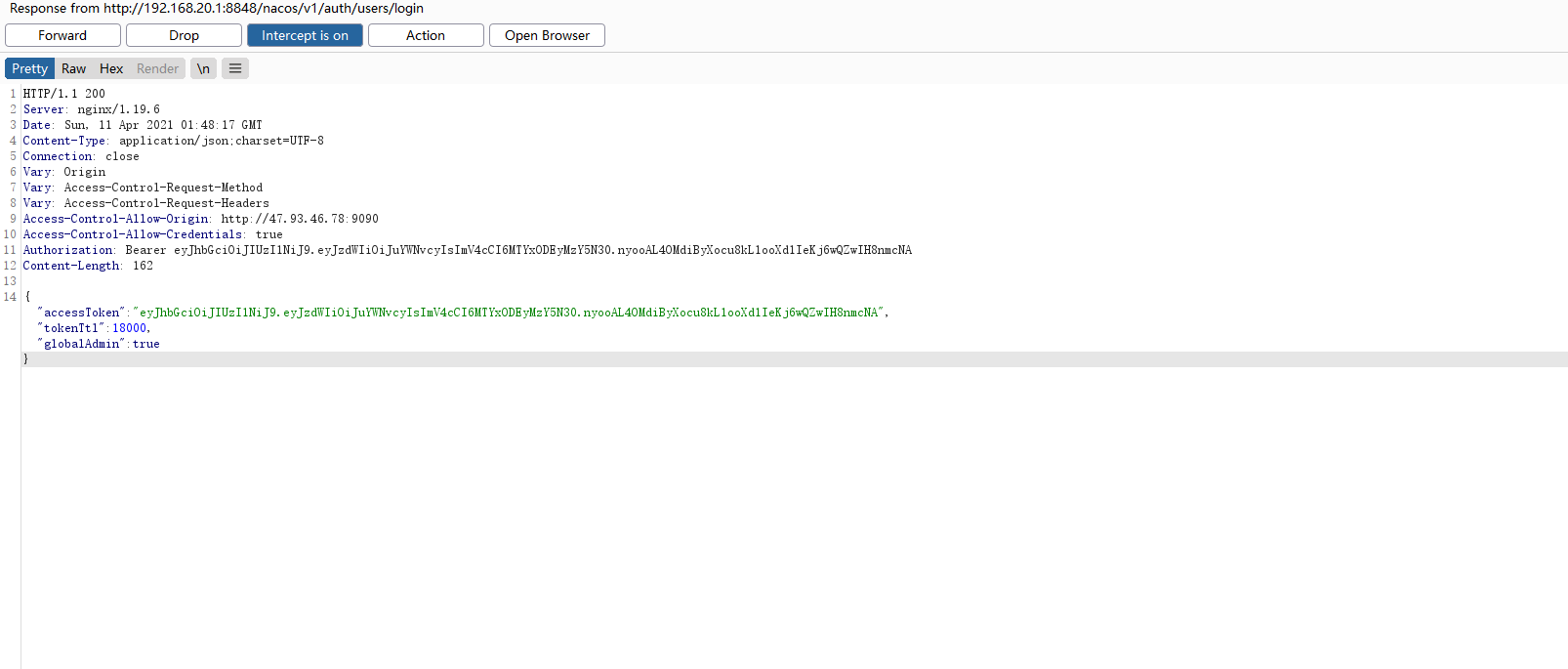 {"accessToken":"eyJhbGciOiJIUzI1NiJ9.eyJzdWIiOiJuYWNvcyIsImV4cCI6MTYxODEyMzY5N30.nyooAL4OMdiByXocu8kL1ooXd1IeKj6wQZwIH8nmcNA","tokenTtl":18000,"globalAdmin":true}