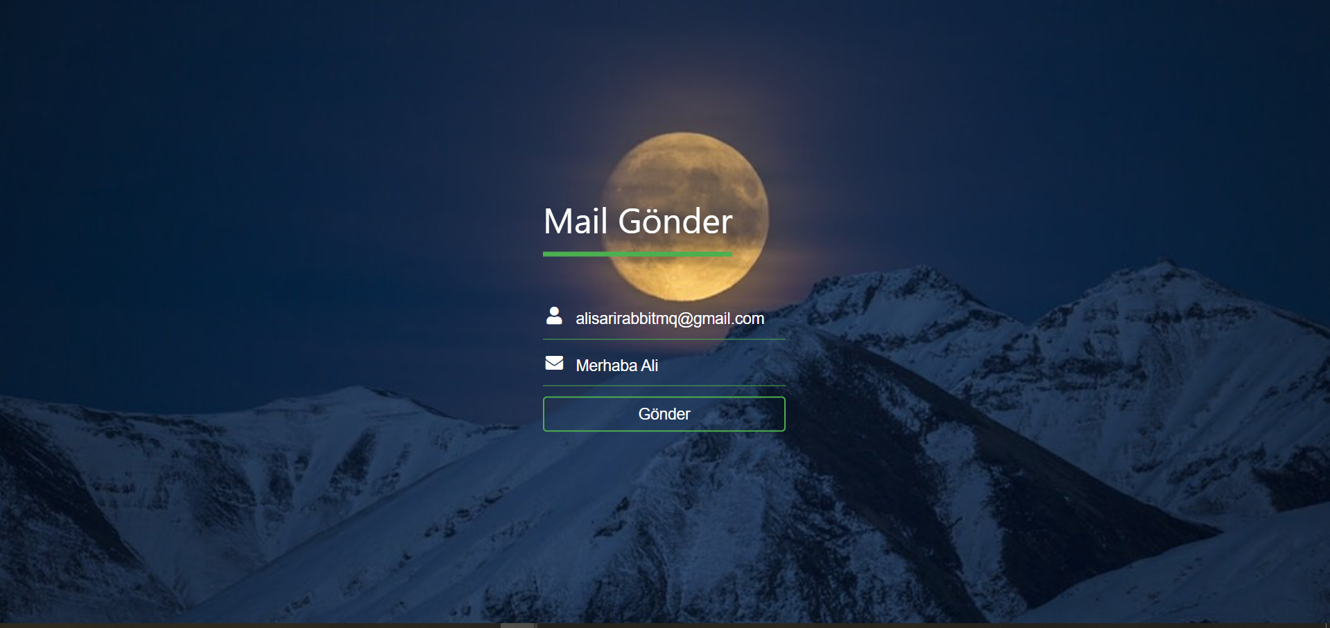 Clinet göndermek istediği mesajı girecek. Mesajı Api dan gönderilmesi çok yorar fazla kişi mesaj gönderirse server bunu kaldıramaz. Gelen mesaj RabbitMQ mesaj kuyruk sistemine gönderilecek. Sonrasında sıralı bir şekilde Consumer yazılımında tek tek işleyip mail atılcak. Atılan mail sonrasında real time da clientlarımıza haber vericeğiz.