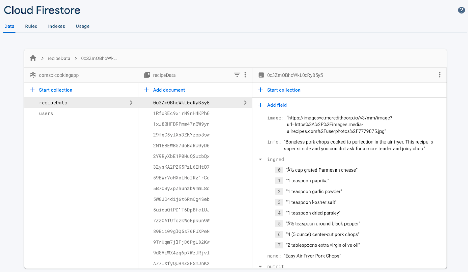 db.collection("recipeData").addDocument(data: ["name": recipeNames[i], "info": recipeDescs[i], "image": recipeImageLinks[i], "ingred": recipeIngredDict[recipeNames[i]], "nutrit": recipeNutDict[recipeNames[i]]])