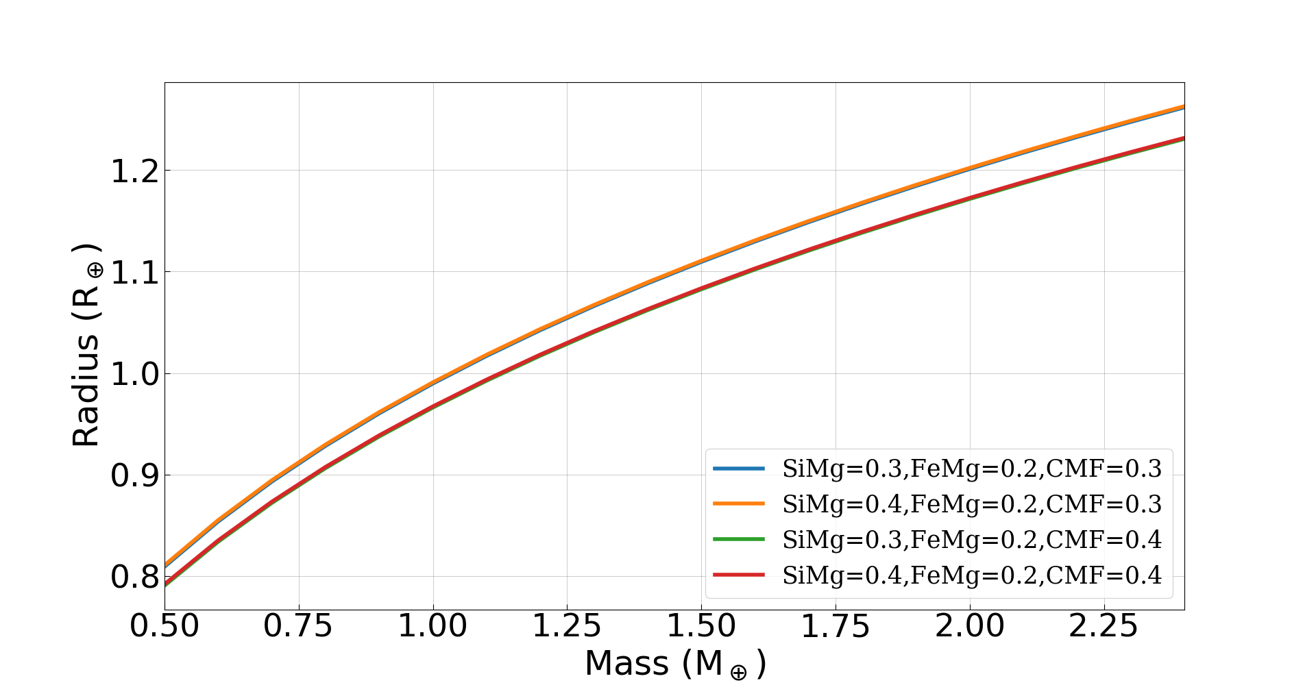 run.mvr_grid(femg = FeMg, simg = SiMg, h2o = wt_h2o, plot =False)Solves for the mass and radius relationship for a range of compositions and masses. Solutions are output as data files and a mass vs. radius plot. Each combination of composition is given a data file. the cmf designation signifies that this function takes in mantle composition and core mass fraction as opposed to mvr_grid, which calculates core mass fraction from bulk elemental abundances.