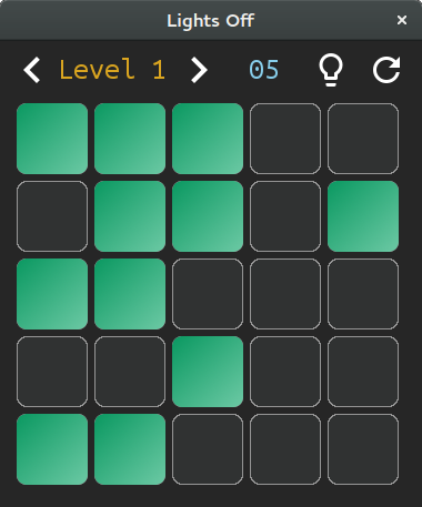 LightsOff A Simple LightsOff game building with libgdx 規則 每個格子是一盞燈,如果點擊一個格子,會反轉該格與其相鄰格(上下左右)格子的狀態,亮的變暗,暗的變亮。你的目標是讓所有格子都變成暗的。 上方按鈕從左至右分別為關卡、點擊次數、提示、重玩這一關。 Origin 這並不是獨創遊戲。請看 維基百科 另外,這個遊戲也是一個程式題目,poj 3279