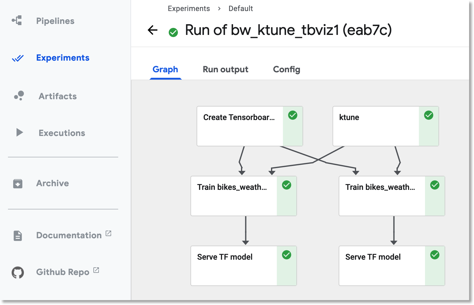 For example, here is the DAG for a pipeline execution that did training and then deployed prediction services for the two best parameter configurations.