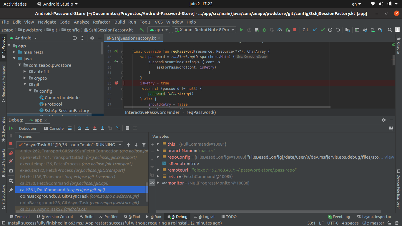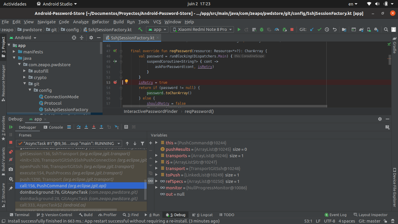 I add captures of the application stack to justify why I think it's the push and pull calls that call this method of displaying the alert dialog. At the bottom left you can see that the first time is called by a pull command and the second time is the push command.