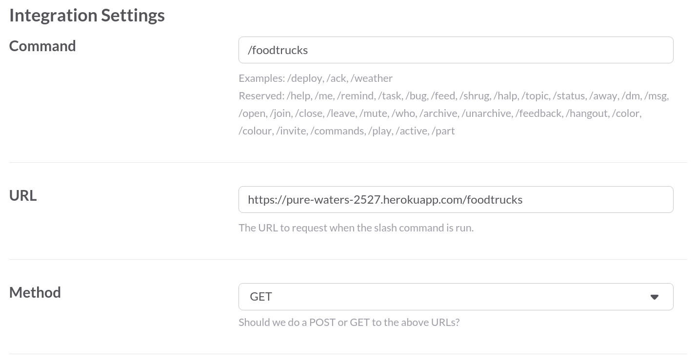 When you're ready, click 'Save Integration' and go ahead and test out your new Slack command! Try going to your Slackbot and typing the command /foodtrucks: