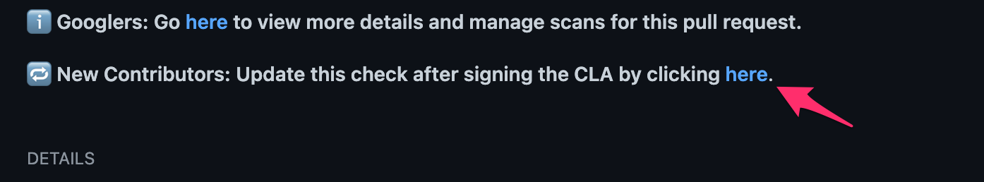 @sugar-cat7 CLAの状態の更新のために cla/google の Detailsから、インストラクションの最後の new contributor 向けのリンクをクリックしてください |