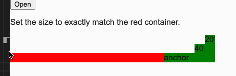 Take a document, that has 400px width. The margin is 20px on the viewport of the overlay. I tried to add one overlay at (300, 20) with size of (80,40). I will use this in the stackblitz and in the calculations.