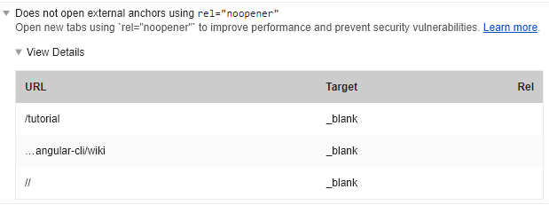 This change fixes a security/performance issue in links that open in new windows, and by the same token, increases the lighthouse score for PWAs. Assuming we (eventually) want a CLI-generated Angular project to be 100% PWA, this is a necessary change.