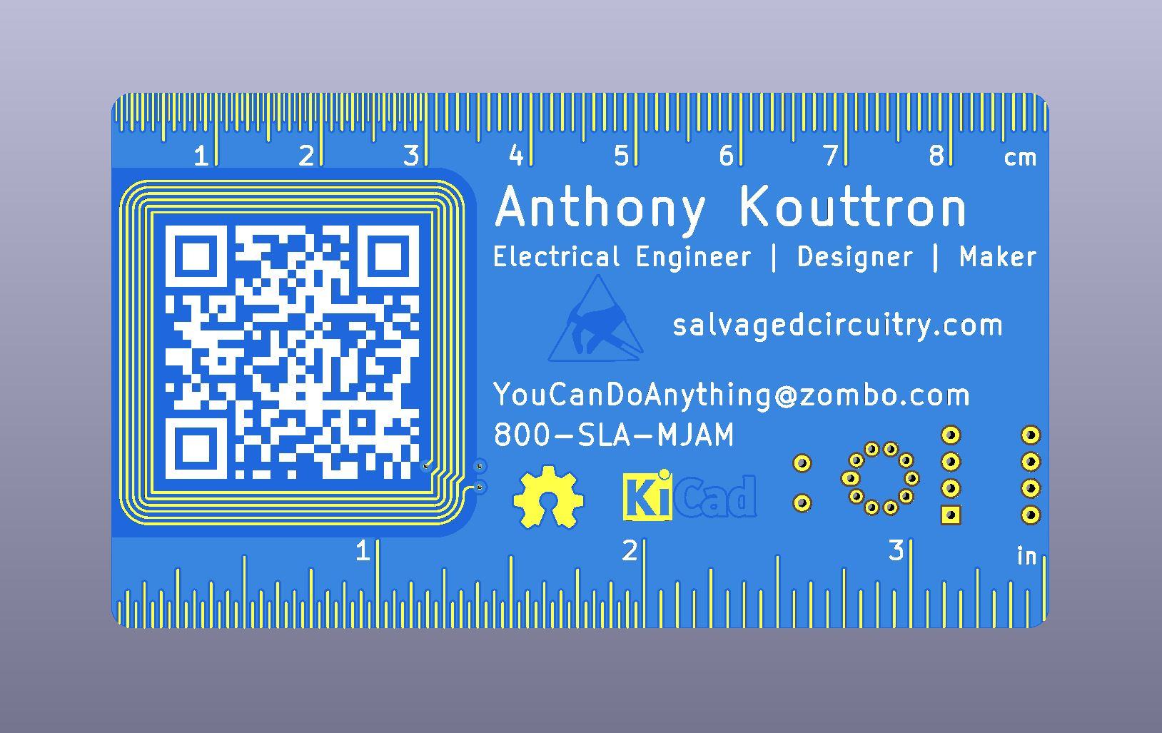 Special thanks to Brian D. Carlton for creating an awesome KiCad business card template. This project is an extension of Brian's original project and is appropriately licensed under a Creative Commons Attribution-NonCommercial-ShareAlike 4.0 International License.