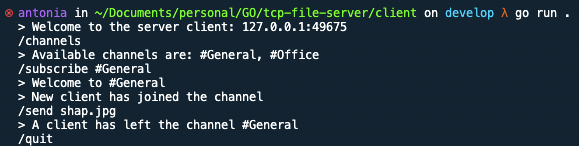 The client is a go terminal program, it allows you to connect to the sever, subscribe to a specific channel, and send or receive files.