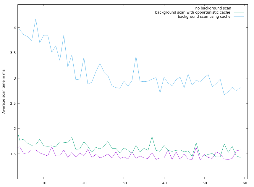 For the threads doing random lookup on a subset of the table, their data just fit in the data cache. The full table did not fit into the cache. For this test scenario all of the data was local for each tserver and it fit in the OS cache, so a cache miss was not terribly slow. Also HDFS was optimized for local data. Cache misses were noticeable from a latency perspective, which is all I cared about. I ran three test all setup with the following Accumulo shell commands. This makes all the scans that set the execution hint For one test run I set the following to make scans that set the execution hint For another test run I set the following to make scans that set the execution hint For the last test run, I just did not run background scans. I only ran the scans doing random lookups. Below are the average time for the scans doing random lookups for the three test runs. If I ran in a situation where cache misses had higher latency, I suspect the plot would differ more dramatically. I wish I had run a 4th test where the random lookup threads did not use cache. In all three test the random lookup threads always used cache. |