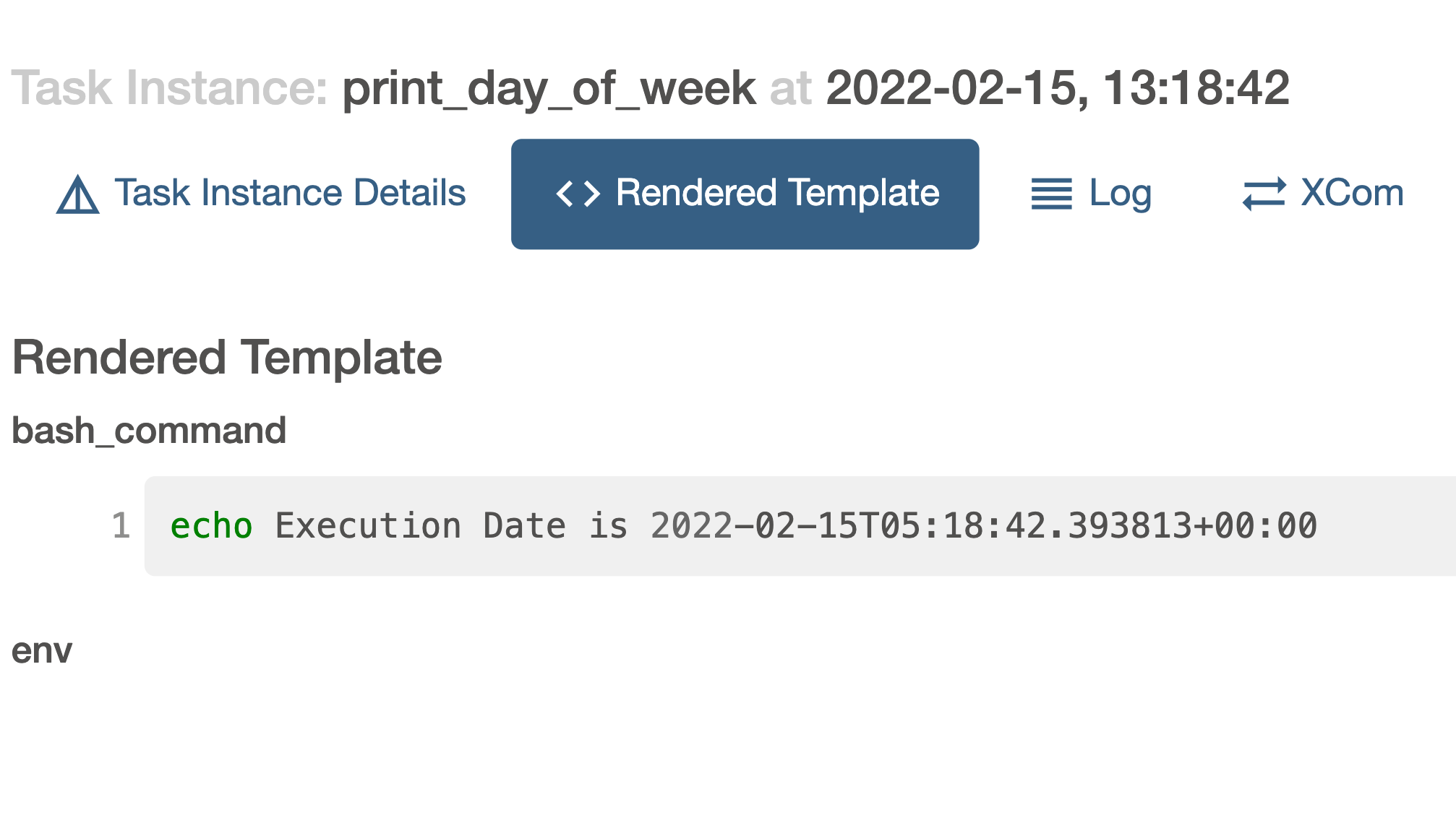 )Enable this DAG on the UI and trigger a manual run using the play button on the top right. Then look into the DAG run's print_day_of_week tasks's Rendered Template and Task Instance Details. Both mention execution date.