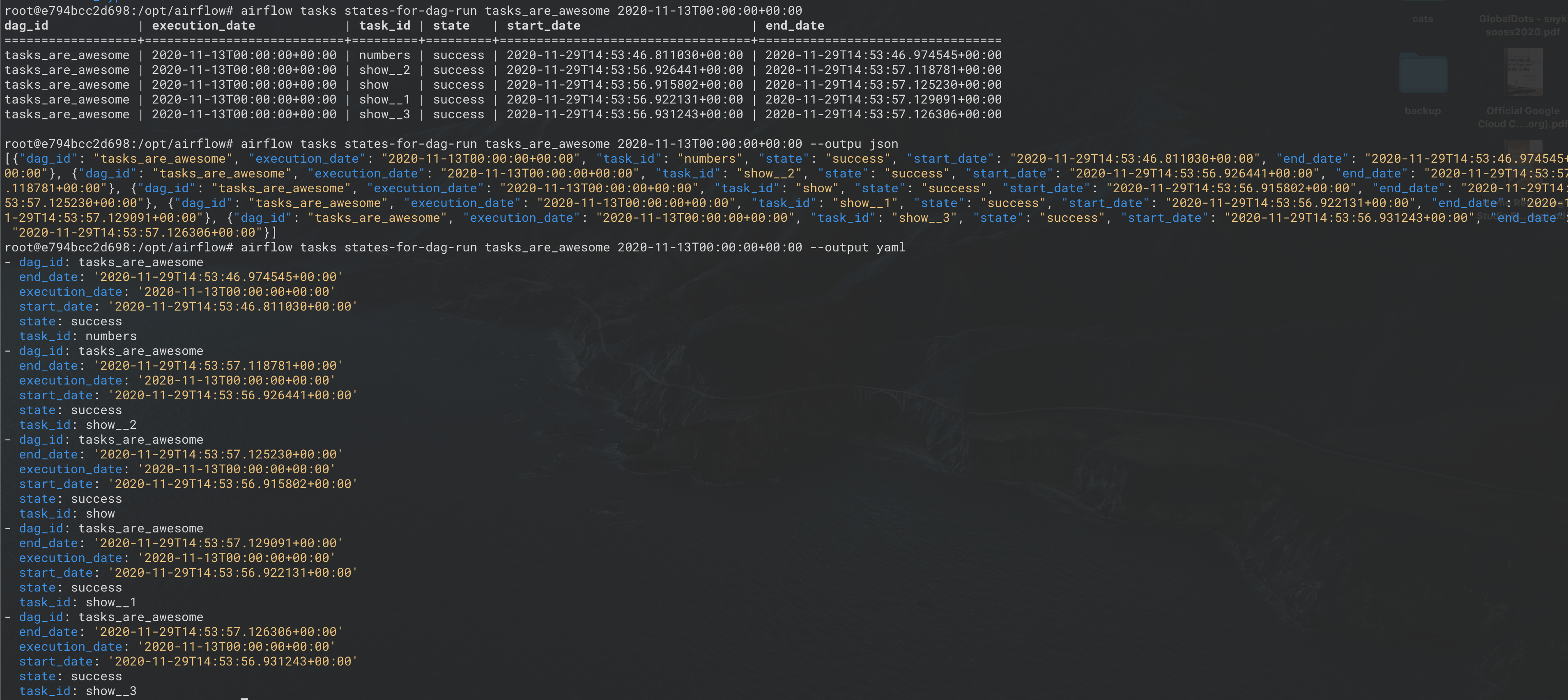 airflow dags listairflow dags reportairflow dags list-runsairflow dags list-jobsairflow connections listairflow connections getairflow pools listairflow pools getairflow pools setairflow pools deleteairflow pools exportairflow role listairflow providers listairflow providers getairflow tasks states-for-dag-runairflow users listairflow variables listExample: