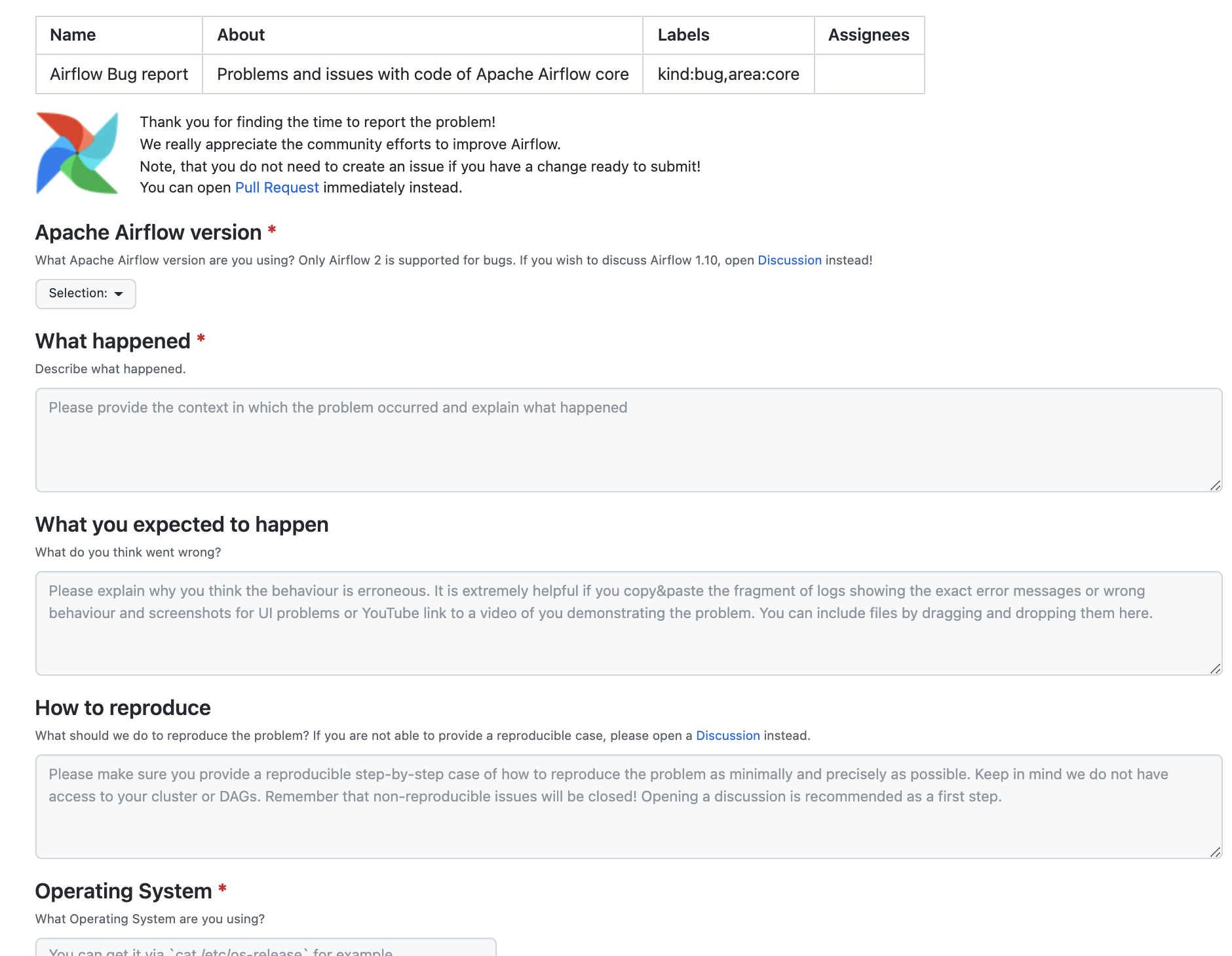 I felt the bug report form was confusing to read, because you start with some issue in mind, and first have to work through "what version", "what deployment", etc. before getting to actually reporting the bug.