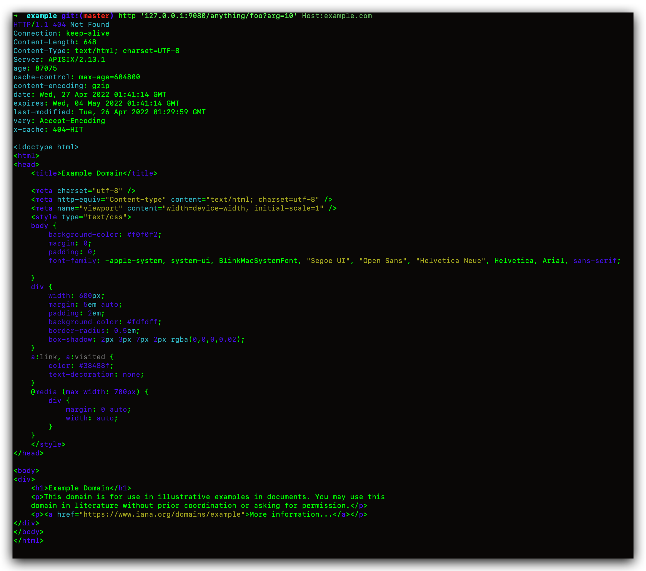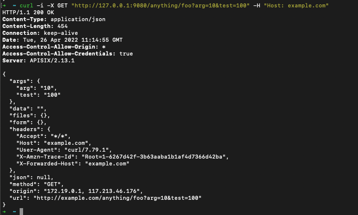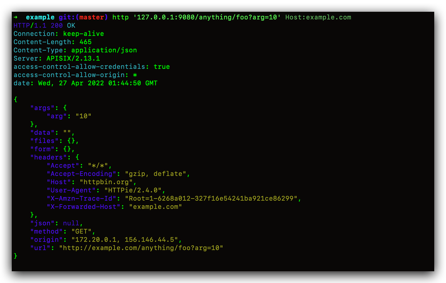 ➜ example git:(master) ✗ curl -i -X GET "http://127.0.0.1:9080/anything/foo?arg=10" -H "Host: example.com"