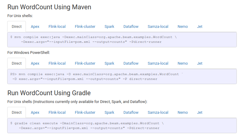 Please let me know if this could be better displayed in an alternate way. If I only include highlight tabs for the ones with current instructions (Direct, Dataflow, and Spark) then the entire runner-switcher under "Run WordCount Using Gradle" disappears if a user clicks on another runner option under "Run WordCount Using Maven". I thought it would make more sense to include the others as placeholders and just mark them as to be added so the whole switcher does not disappear and it's clear where the instruction will be added in the future.