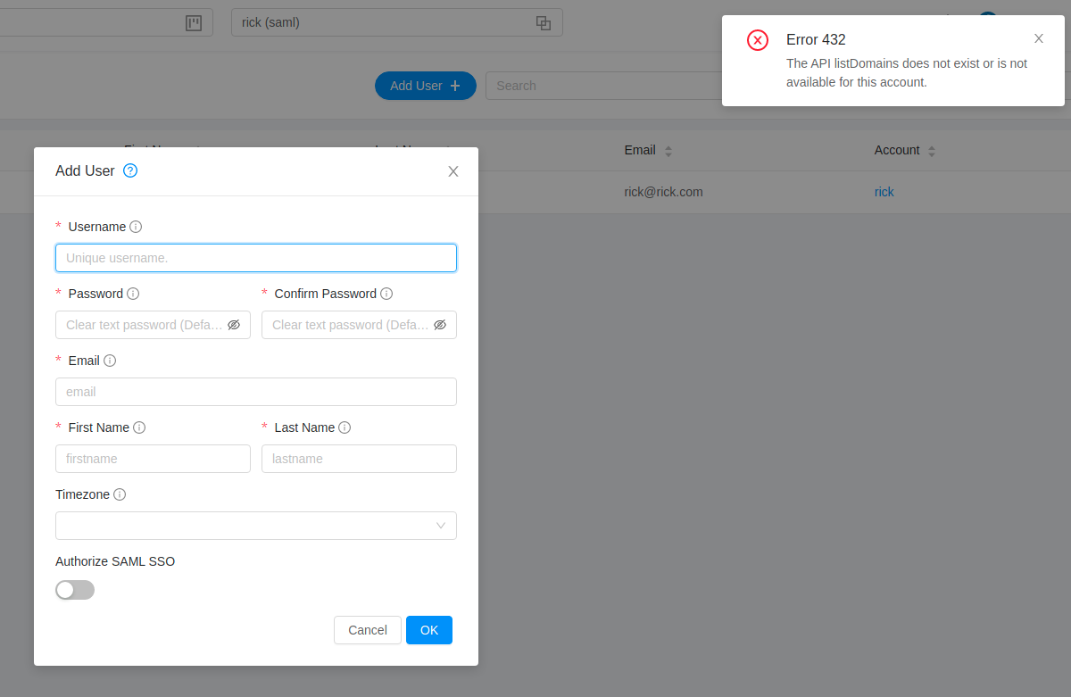 Note: this form also seems to pass invalid entityid in the API, so the user isn't really SAML enabled. @shwstppr please also test/fix any issues with the createAccount form (which also has the saml authorisation option). |