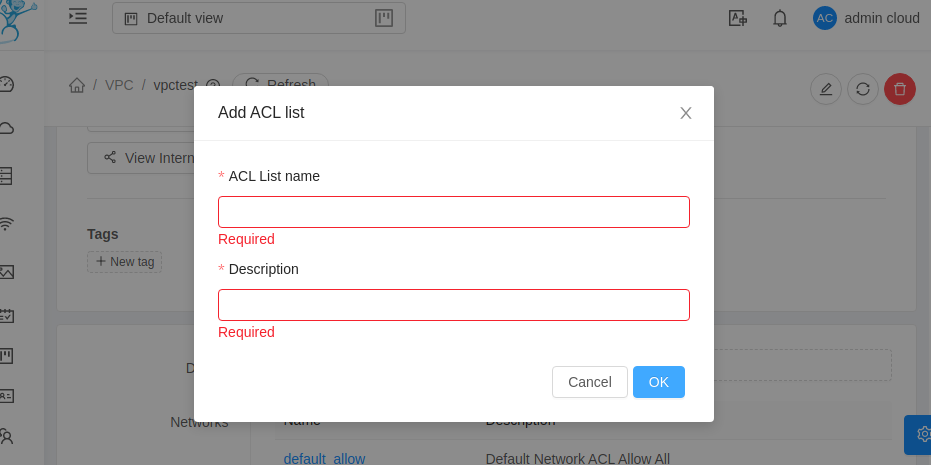 fix UI VPC add ACL without required input close ui Without any input, click ok button then close the ui . We need display ui to confirm all required input. |