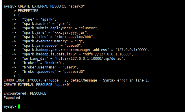 - 执行 CREATE EXTERNAL RESOURCE "spark0"