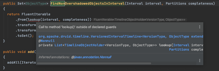 lookup(Interval interval, Partitions completeness)requires the caller to acquire a read lock, butfindNonOvershadowedObjectsInIntervalisn't doing it.