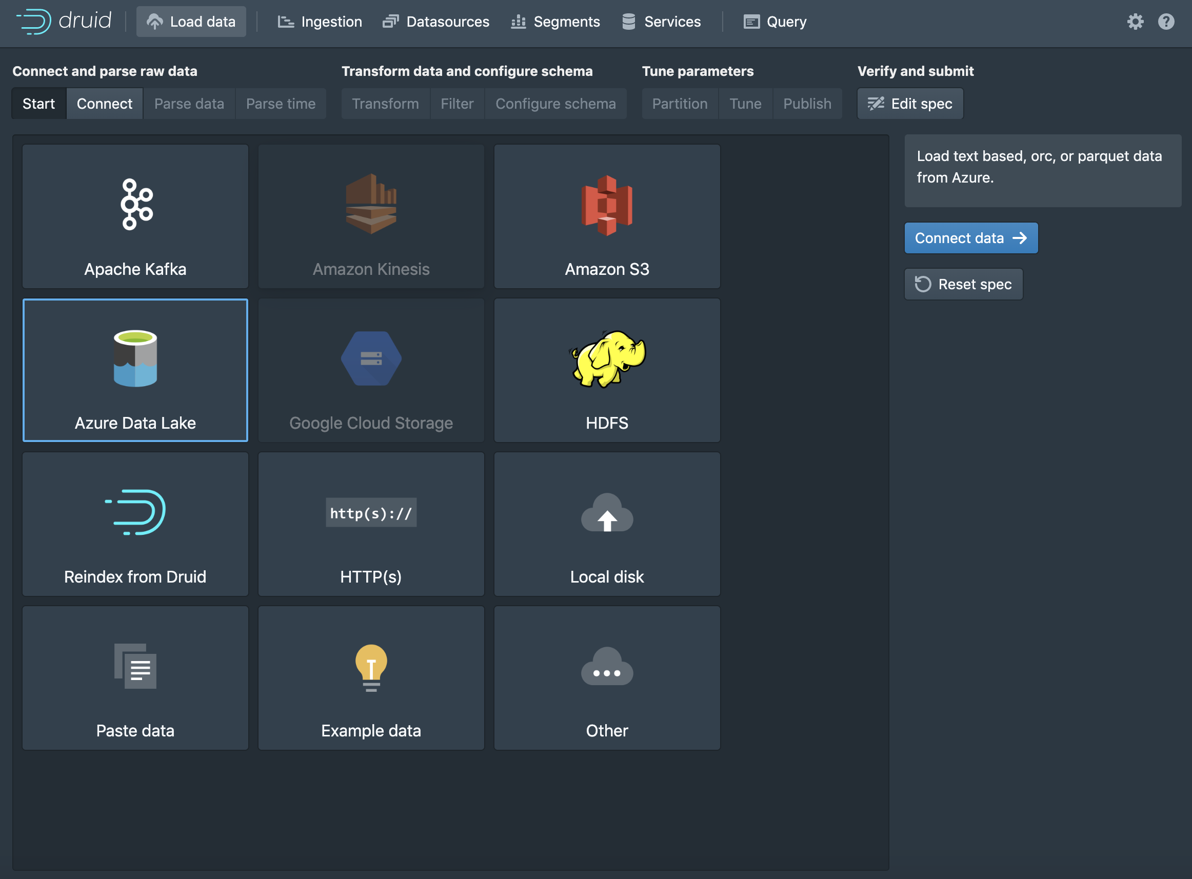 **Please do not merge until support for azure has been merged**Adds the ability to ingest data from azure via the web console. There is now a tile that allows the user to access the Azure ingestion flow if druid-azure-extensions is in the load list. The default input type will be azure. The user can then put a can then input data using A URI or a Prefix. the resulting IO config changes will be :