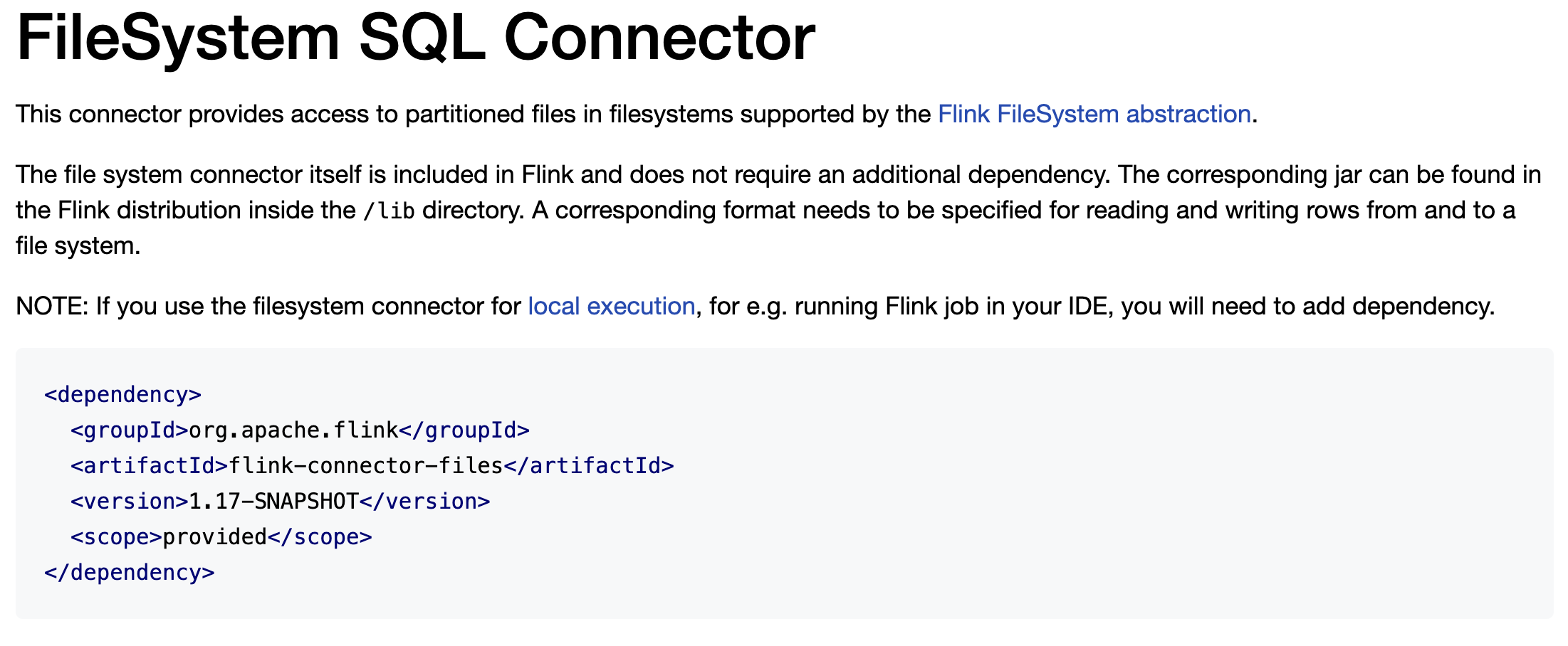 The file system SQL connector itself is included in Flink and does not require an additional dependency. However, if a user uses the filesystem connector for local execution, for e.g. running Flink job in the IDE, she will need to add dependency. Otherwise, the user will get validation exception: