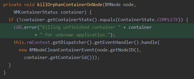 | LOG.warn("Killing container " + container + " for unknown application"); |