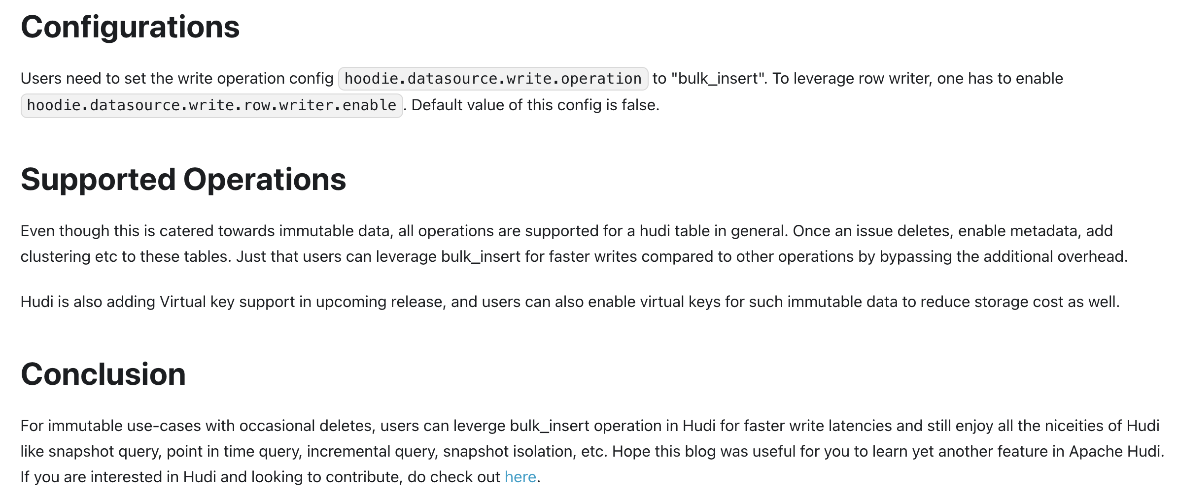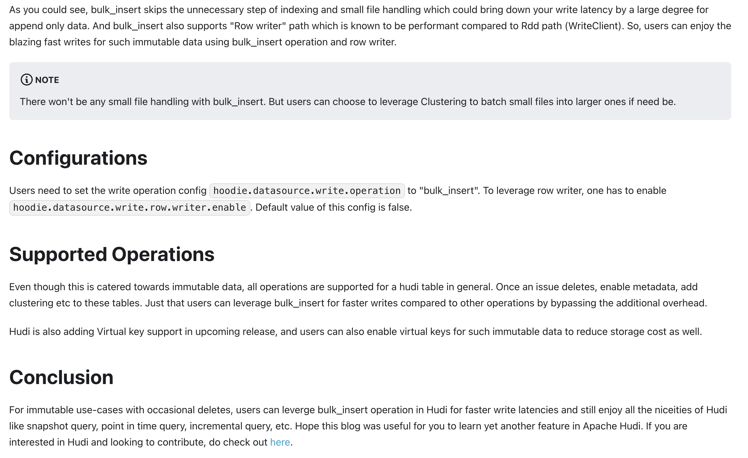+your write latency by a large degree for append only data. And bulk_insert also supports "Row writer" path which