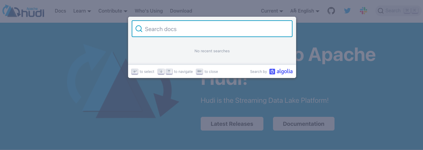 Note: The search bar was rendered correctly but it wasn't loading any results since the domain is not hudi.apache.org, once we push to prod, the search will show up results.