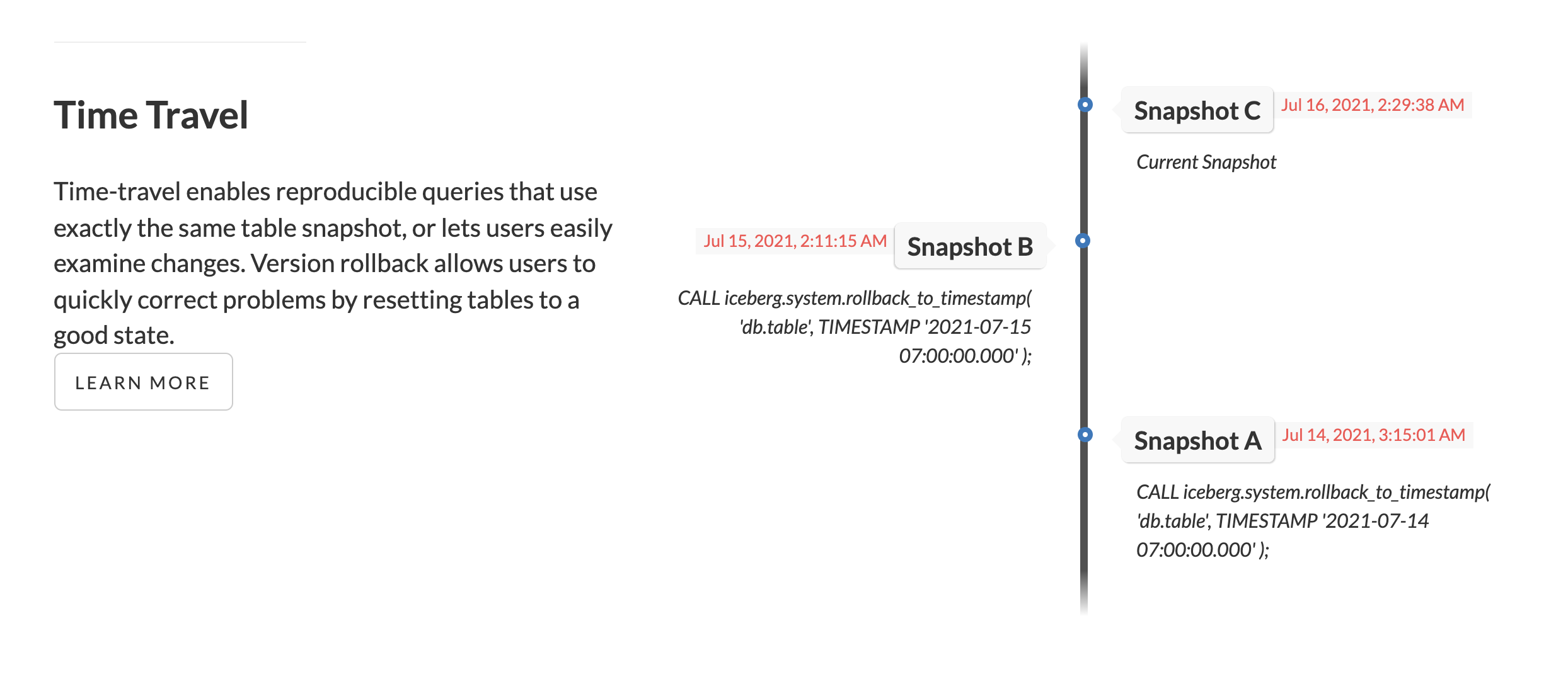 I have the same reaction as @RussellSpitzer. I like the visualization of snapshots, but I don't consider rollback to be time travel. Rollback alters the state of the table, while time travel actually reads older versions. The trouble here is that there isn't a good SQL demonstration of time travel yet. We've added table names for time travel in 3.2, but we're waiting for Spark 3.3 to get the spark.read.option("as-of-timestamp", System.currentTimeMillis() - ONE_DAY_MS).load("db.table) |