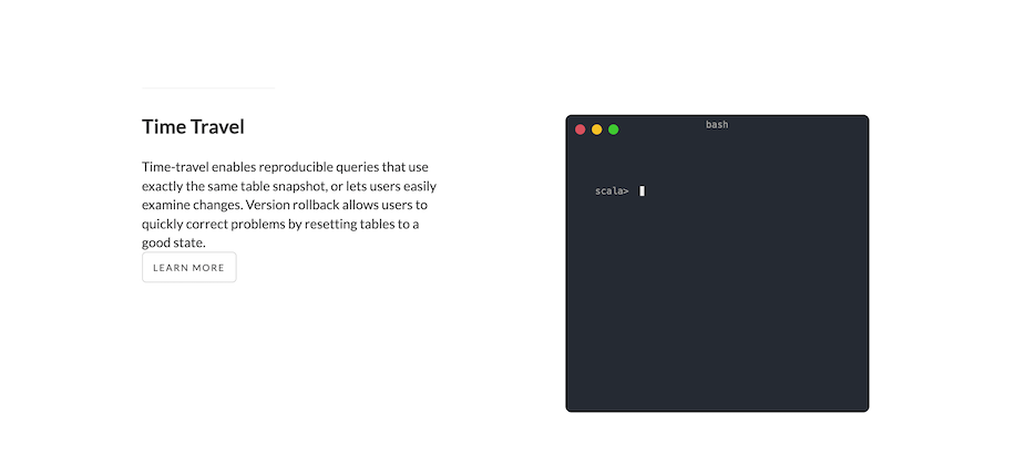 Changed this to be a termynal example. Does the sentence "Version rollback allows users to quickly correct problems by resetting tables to a good state." still fit in here or is it better to just remove it completely? spark-time-travel.mp4 |