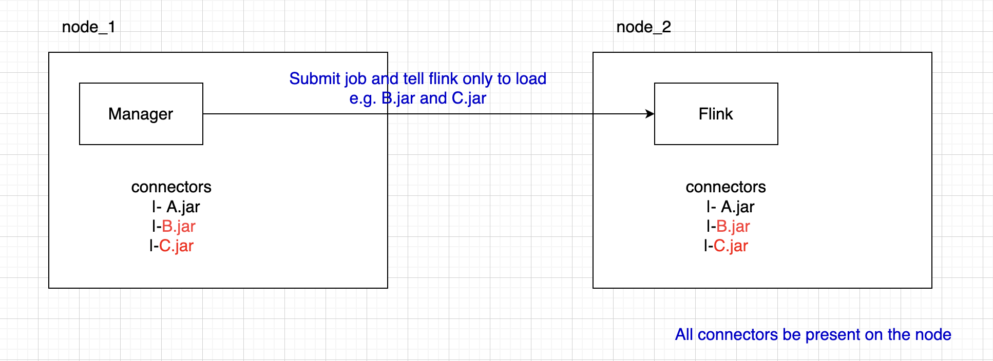 The current job submits implementation requires the dependent jars to be all present on the Flink node. This is not convenient when the Flink nodes are different from the manager nodes: