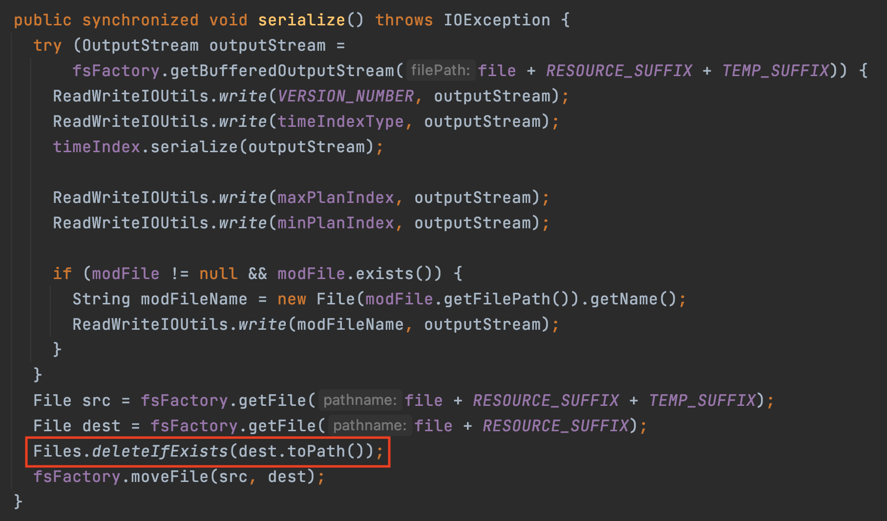 at org.apache.iotdb.db.engine.storagegroup.TsFileResource.serialize(TsFileResource.java:257)