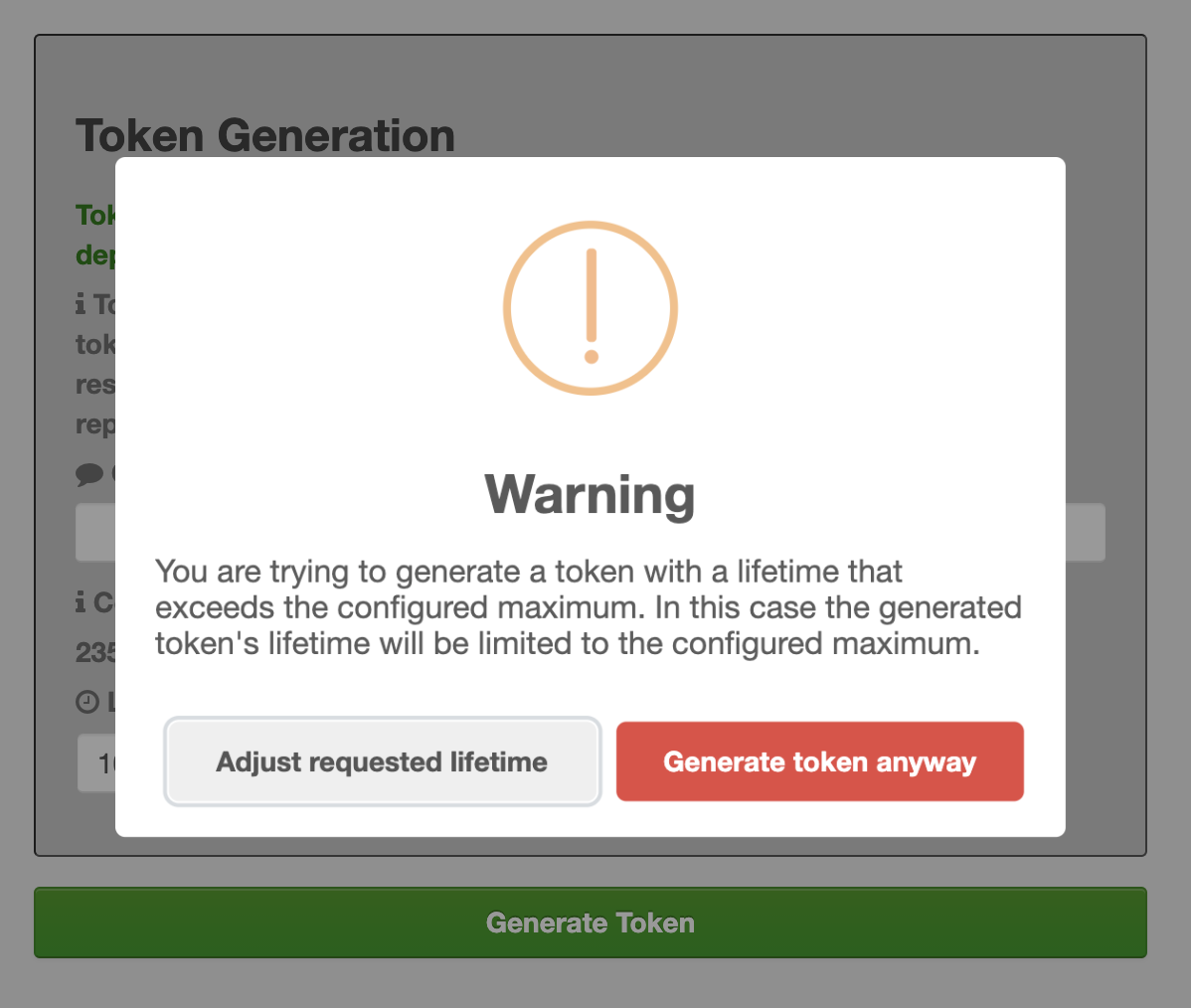 knox.token.ttlin the relevant topology). In case end-users wants to generate a token that exceeds the configured maximum, a confirmation window is shown where we explain the side effects.Please note that if