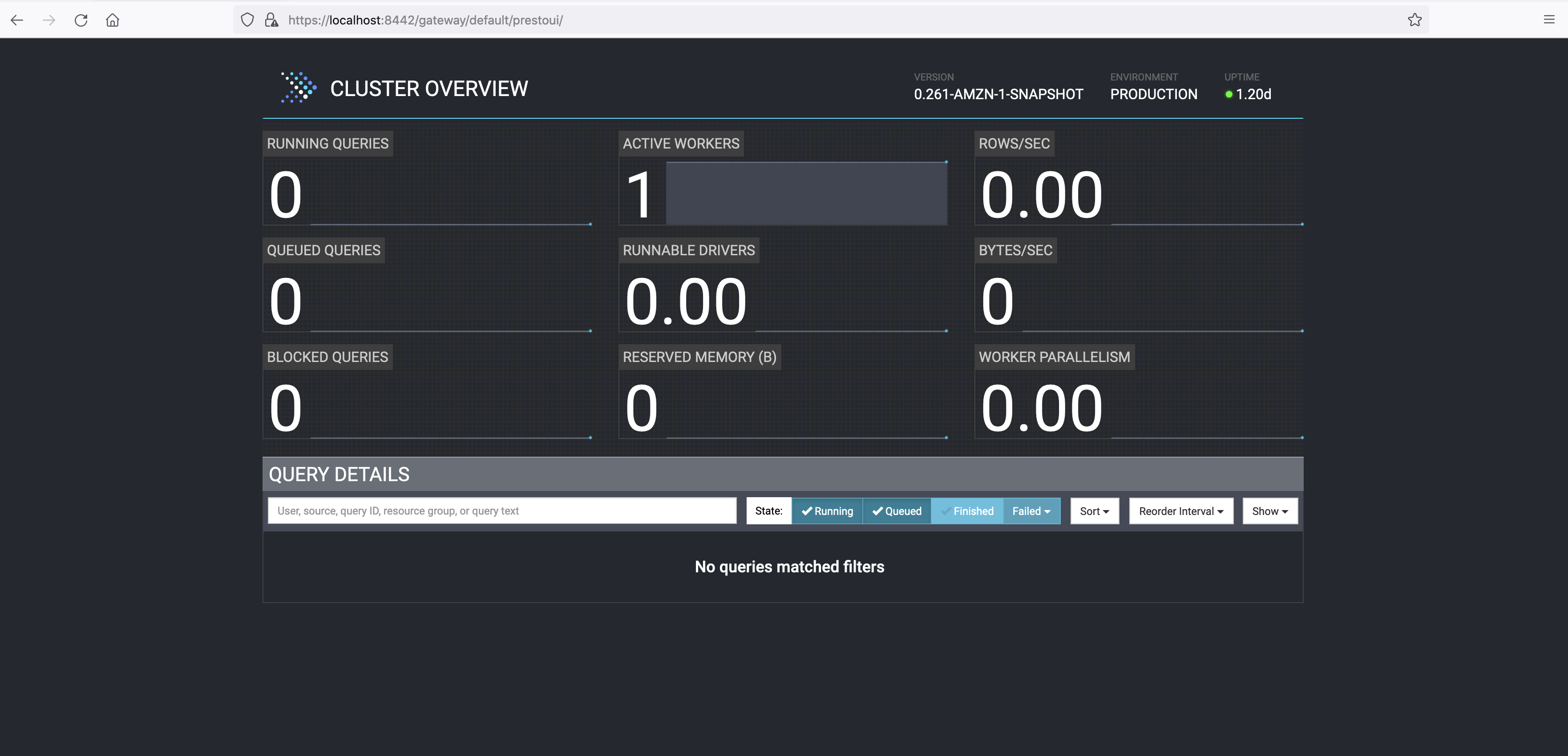 curl --insecure https://localhost:8442/gateway/default/presto/v1/statement/queued/20220517_112614_00000_muw7k/1?slug=x31aa07b4664b44de90fe15c2e2a758cc{"id":"20220517_112614_00000_muw7k","infoUri":"https://localhost:8442/gateway/default/presto/ui/query.html?20220517_112614_00000_muw7k","nextUri":"https://localhost:8442/gateway/default/presto/v1/statement/queued/20220517_112614_00000_muw7k/2?slug=x31aa07b4664b44de90fe15c2e2a758cc","stats":{"state":"WAITING_FOR_PREREQUISITES","waitingForPrerequisites":true,"queued":false,"scheduled":false,"nodes":0,"totalSplits":0,"queuedSplits":0,"runningSplits":0,"completedSplits":0,"cpuTimeMillis":0,"wallTimeMillis":0,"waitingForPrerequisitesTimeMillis":6,"queuedTimeMillis":0,"elapsedTimeMillis":6,"processedRows":0,"processedBytes":0,"peakMemoryBytes":0,"peakTotalMemoryBytes":0,"peakTaskTotalMemoryBytes":0,"spilledBytes":0},"warnings":[]}