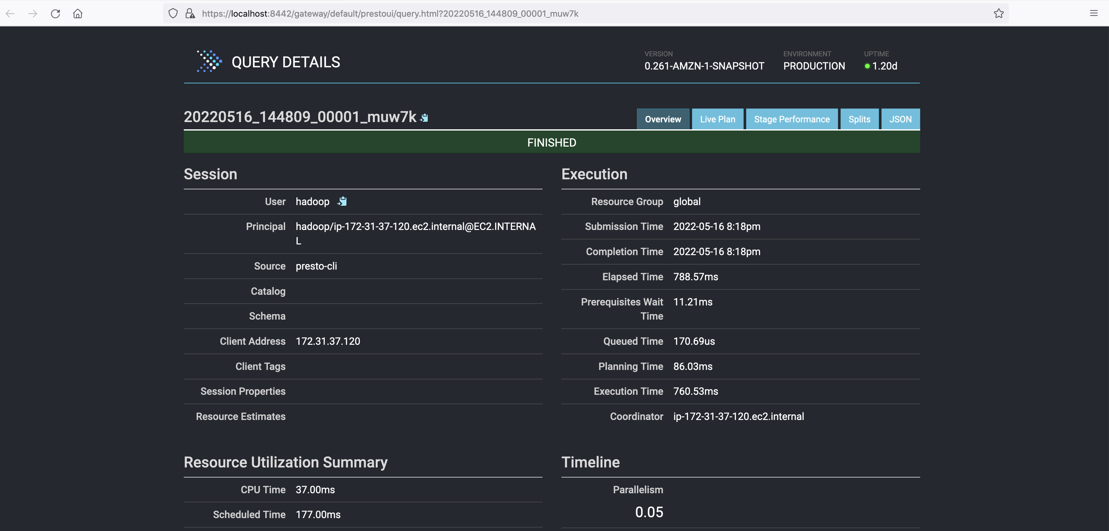 curl --insecure https://localhost:8442/gateway/default/presto/v1/statement/queued/20220517_112614_00000_muw7k/2?slug=x31aa07b4664b44de90fe15c2e2a758cc{"id":"20220517_112614_00000_muw7k","infoUri":"https://localhost:8442/gateway/default/presto/ui/query.html?20220517_112614_00000_muw7k","partialCancelUri":"https://localhost:8442/gateway/default/presto/v1/stage/20220517_112614_00000_muw7k.0","nextUri":"https://localhost:8442/gateway/default/presto/v1/statement/executing/20220517_112614_00000_muw7k/1?slug=x31aa07b4664b44de90fe15c2e2a758cc","columns":[{"name":"Catalog","type":"varchar(14)","typeSignature":{"rawType":"varchar","typeArguments":[],"literalArguments":[],"arguments":[{"kind":"LONG_LITERAL","value":14}]}}],"data":[["awsdatacatalog"],["hive"],["system"]],"stats":{"state":"RUNNING","waitingForPrerequisites":false,"queued":false,"scheduled":true,"nodes":1,"totalSplits":19,"queuedSplits":0,"runningSplits":0,"completedSplits":19,"cpuTimeMillis":14,"wallTimeMillis":141,"waitingForPrerequisitesTimeMillis":15,"queuedTimeMillis":0,"elapsedTimeMillis":12522,"processedRows":0,"processedBytes":0,"peakMemoryBytes":0,"peakTotalMemoryBytes":171,"peakTaskTotalMemoryBytes":171,"spilledBytes":0,"rootStage":{"stageId":"0","state":"RUNNING","done":false,"nodes":1,"totalSplits":1,"queuedSplits":0,"runningSplits":0,"completedSplits":1,"cpuTimeMillis":1,"wallTimeMillis":3,"processedRows":3,"processedBytes":67,"subStages":[{"stageId":"1","state":"FINISHED","done":true,"nodes":1,"totalSplits":17,"queuedSplits":0,"runningSplits":0,"completedSplits":17,"cpuTimeMillis":13,"wallTimeMillis":138,"processedRows":3,"processedBytes":67,"subStages":[{"stageId":"2","state":"FINISHED","done":true,"nodes":1,"totalSplits":1,"queuedSplits":0,"runningSplits":0,"completedSplits":1,"cpuTimeMillis":0,"wallTimeMillis":0,"processedRows":3,"processedBytes":0,"subStages":[]}]}]},"runtimeStats":{"S1-driverCountPerTask":{"name":"S1-driverCountPerTask","sum":17,"count":1,"max":17,"min":17},"S2-driverCountPerTask":{"name":"S2-driverCountPerTask","sum":1,"count":1,"max":1,"min":1},"S1-taskElapsedTimeNanos":{"name":"S1-taskElapsedTimeNanos","sum":142799852,"count":1,"max":142799852,"min":142799852},"S2-taskElapsedTimeNanos":{"name":"S2-taskElapsedTimeNanos","sum":106038415,"count":1,"max":106038415,"min":106038415},"S0-driverCountPerTask":{"name":"S0-driverCountPerTask","sum":1,"count":1,"max":1,"min":1},"S0-taskElapsedTimeNanos":{"name":"S0-taskElapsedTimeNanos","sum":0,"count":1,"max":0,"min":0}},"progressPercentage":100.0},"warnings":[]}